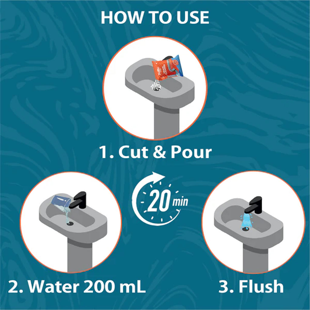 Empty the sachet into the dry drain.