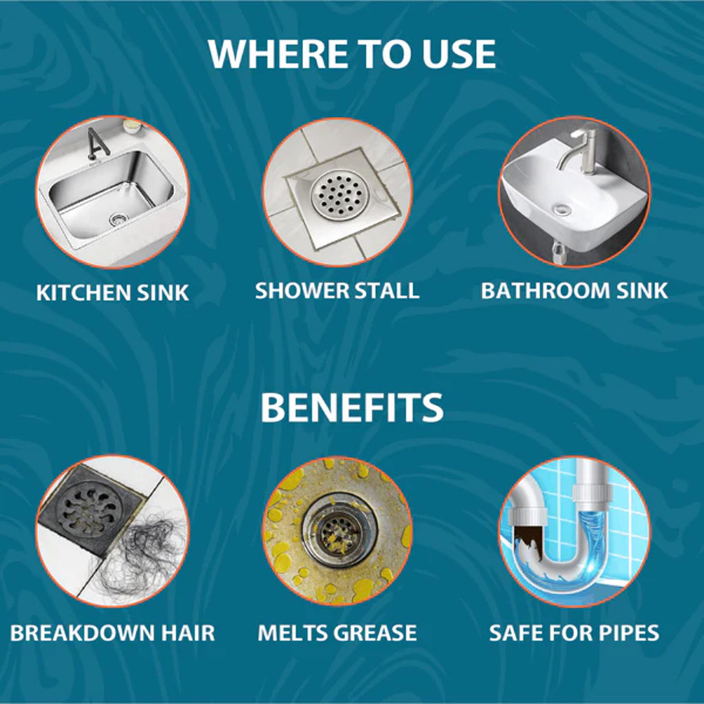 Restore free-flowing drains in minutes with this single-use drain cleaner sachet. The concentrated formula foams into action to break down hair, grease, food residue and soap scum that slow or block pipes. Simply pour the contents into the drain, add water as directed, wait, and flush—no tools or messy plunging required. Designed for routine maintenance as well as stubborn clogs, it helps eliminate bad odours and keeps pipes clear in kitchens, bathrooms and utility areas. Compact and easy to store, one sachet delivers a full treatment whenever you need it.